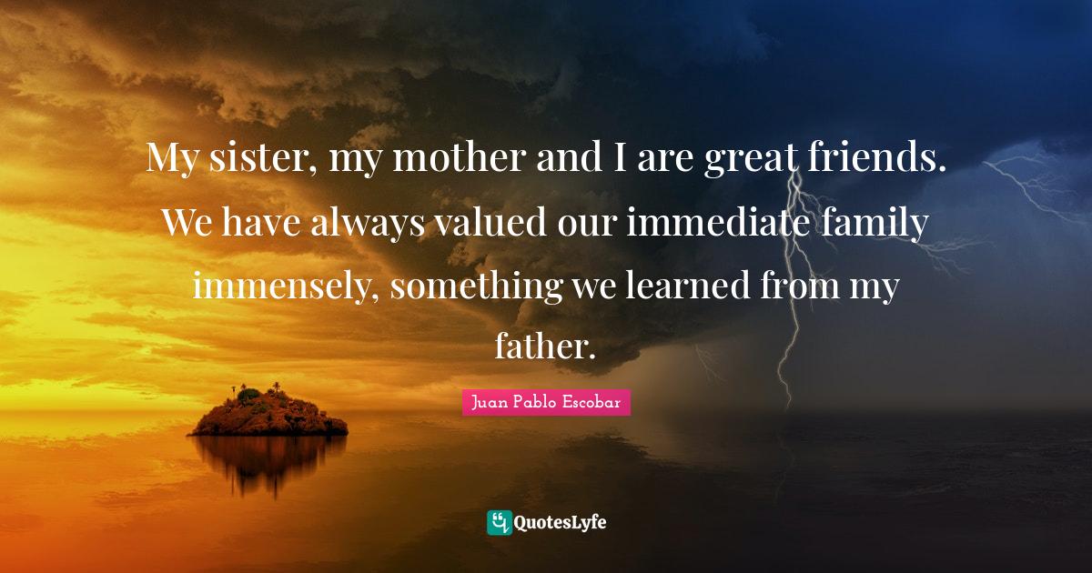 This page presents the quote "My sister, my mother and I are great friends. We have always valued our immediate family immensely, something we learned from my father.". Author of this quote is Juan Pablo Escobar. This quote is about mother, my sister, friends, father, immediate family, great friend,.