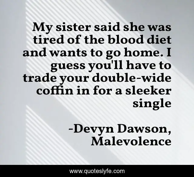 This page presents the quote "My sister said she was tired of the blood diet and wants to go home. I guess you'll have to trade your double-wide coffin in for a sleeker single". Author of this quote is Devyn Dawson, Malevolence. This quote is about werewolves, abel-casey, vampires,.