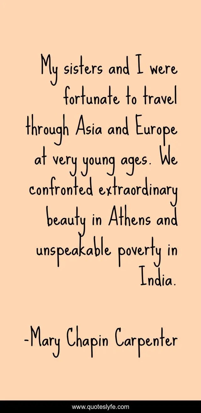 This page presents the quote "My sisters and I were fortunate to travel through Asia and Europe at very young ages. We confronted extraordinary beauty in Athens and unspeakable poverty in India.". Author of this quote is Mary Chapin Carpenter. This quote is about poverty, young, beauty,.