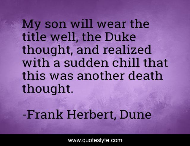 This page presents the quote "My son will wear the title well, the Duke thought, and realized with a sudden chill that this was another death thought.". Author of this quote is Frank Herbert, Dune. This quote is about parenthood, legacy, leadership, heritage, discipleship, mortality,.