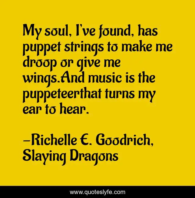 This page presents the quote "My soul, I’ve found, has puppet strings to make me droop or give me wings.And music is the puppeteerthat turns my ear to hear.". Author of this quote is Richelle E. Goodrich, Slaying Dragons. This quote is about richelle-goodrich, power-of-music, richelle, music, richelle-e-goodrich,.