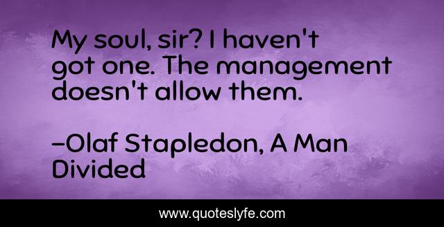 This page presents the quote "My soul, sir? I haven't got one. The management doesn't allow them.". Author of this quote is Olaf Stapledon, A Man Divided. This quote is about management, work,.