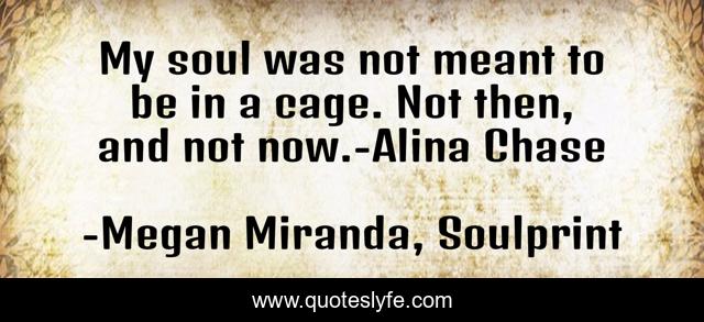 This page presents the quote "My soul was not meant to be in a cage. Not then, and not now.-Alina Chase". Author of this quote is Megan Miranda, Soulprint. This quote is about alina-chase, soul, soulprint,.