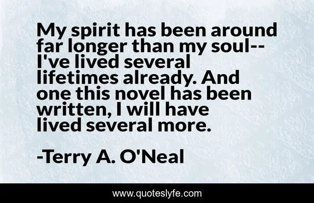 This page presents the quote "My spirit has been around far longer than my soul--I've lived several lifetimes already. And one this novel has been written, I will have lived several more.". Author of this quote is Terry A. O'Neal. This quote is about novels, writers-life, fiction, books, darling, writers-world,.