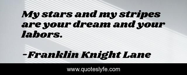 This page presents the quote "My stars and my stripes are your dream and your labors.". Author of this quote is Franklin Knight Lane. This quote is about dream, stripes, stars,.