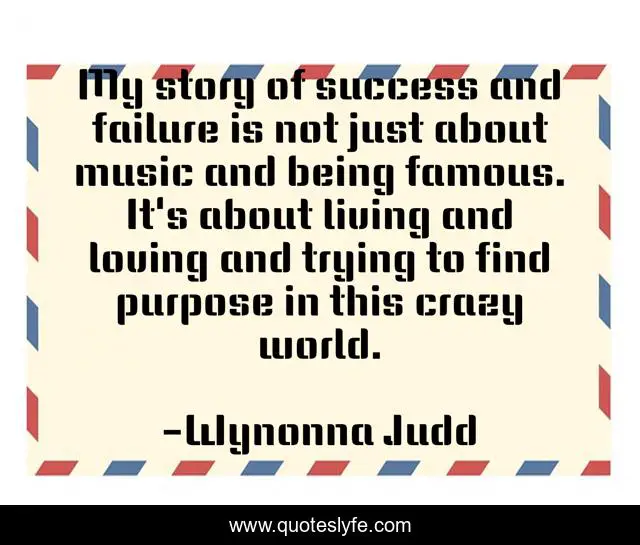 This page presents the quote "My story of success and failure is not just about music and being famous. It's about living and loving and trying to find purpose in this crazy world.". Author of this quote is Wynonna Judd. This quote is about failure, music, success,.