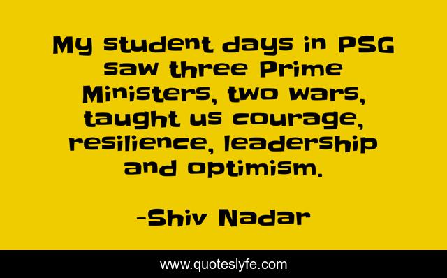This page presents the quote "My student days in PSG saw three Prime Ministers, two wars, taught us courage, resilience, leadership and optimism.". Author of this quote is Shiv Nadar. This quote is about courage, resilience,.