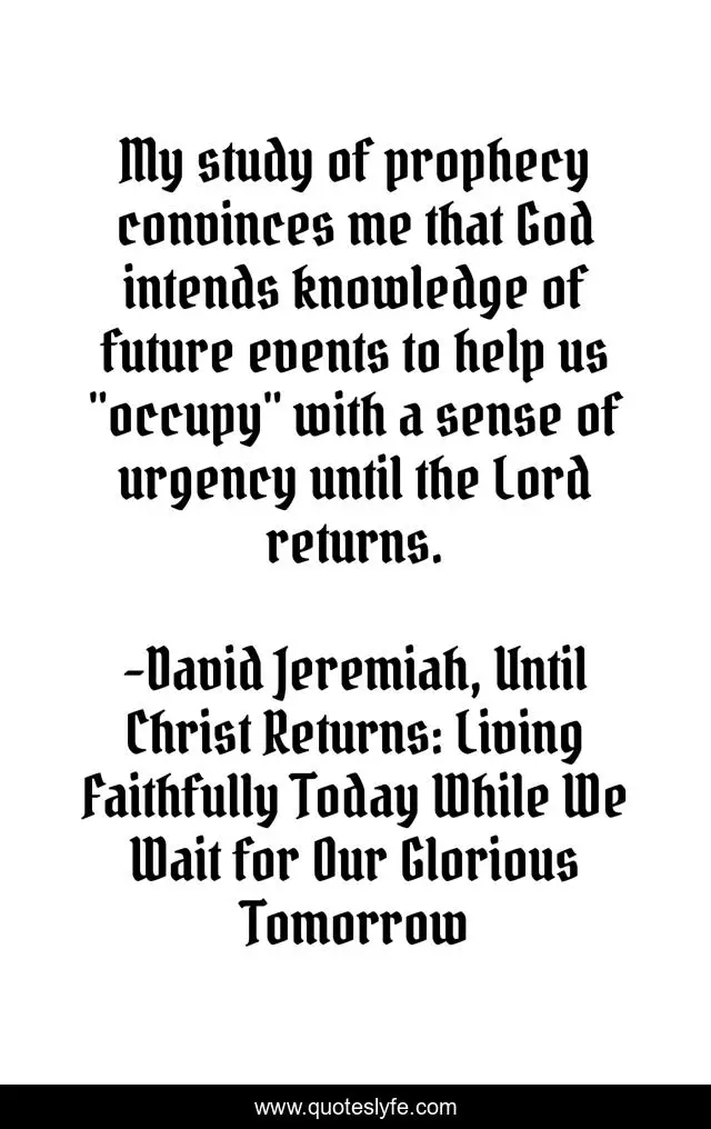 This page presents the quote "My study of prophecy convinces me that God intends knowledge of future events to help us "occupy" with a sense of urgency until the Lord returns.". Author of this quote is David Jeremiah, Until Christ Returns: Living Faithfully Today While We Wait for Our Glorious Tomorrow. This quote is about enthusiasm, inspirational,.