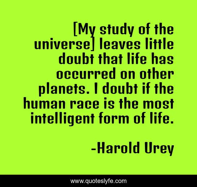 This page presents the quote "[My study of the universe] leaves little doubt that life has occurred on other planets. I doubt if the human race is the most intelligent form of life.". Author of this quote is Harold Urey. This quote is about human-race, nobel-laureate, intelligence, universe, alien-life, science, astrobiology,.