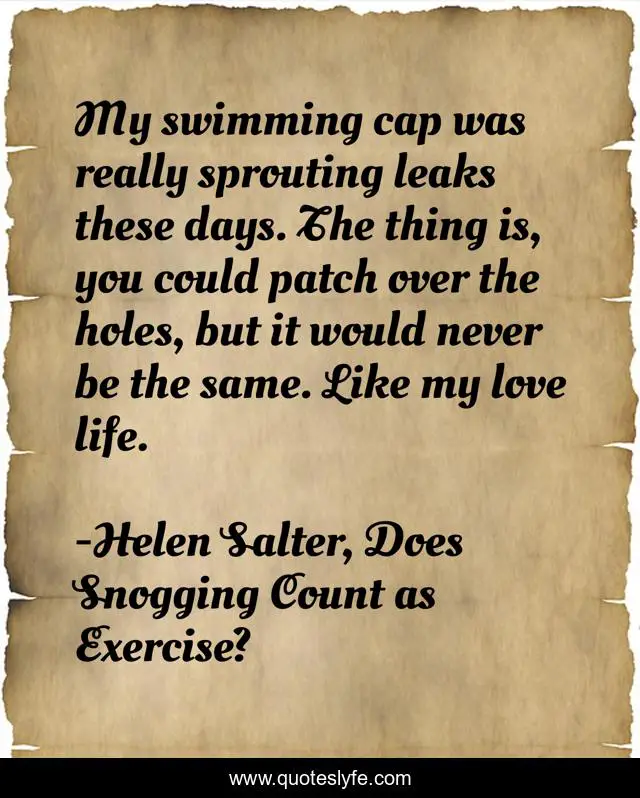 "Helen Salter, Does Snogging Count as Exercise? Quotes." Quoteslyfe.com, 2025. Tue. 09 Dec. 2025. <https://www.quoteslyfe.com/quote/My-swimming-cap-was-really-sprouting-leaks-248000>.