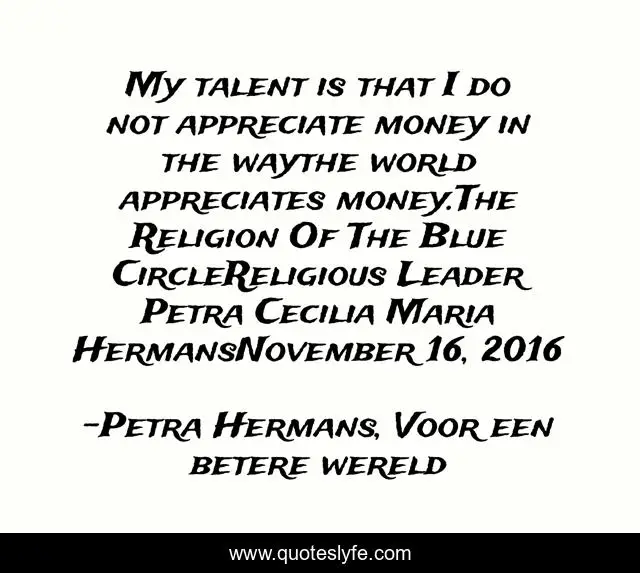 This page presents the quote "My talent is that I do not appreciate money in the waythe world appreciates money.The Religion Of The Blue CircleReligious Leader Petra Cecilia Maria HermansNovember 16, 2016". Author of this quote is Petra Hermans, Voor een betere wereld. .