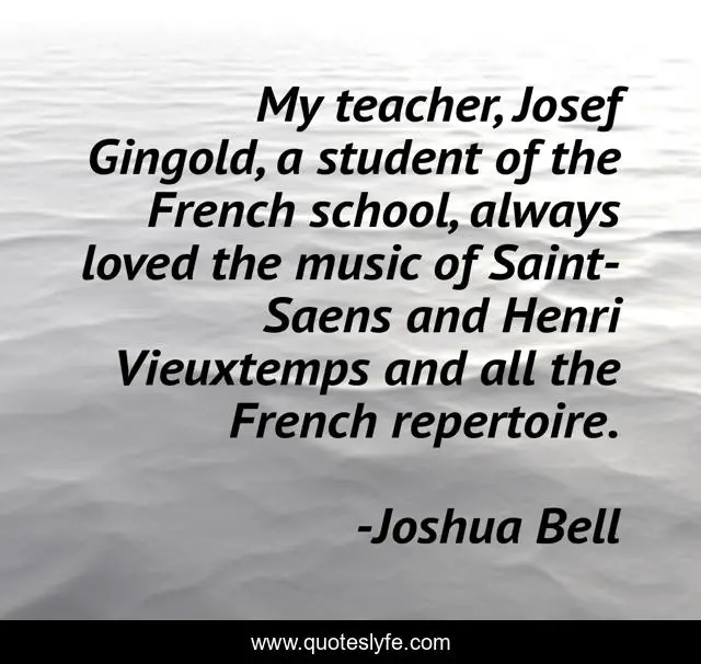 This page presents the quote "My teacher, Josef Gingold, a student of the French school, always loved the music of Saint-Saens and Henri Vieuxtemps and all the French repertoire.". Author of this quote is Joshua Bell. This quote is about school, music, student,.