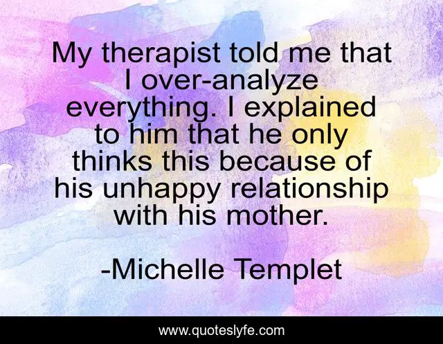 This page presents the quote "My therapist told me that I over-analyze everything. I explained to him that he only thinks this because of his unhappy relationship with his mother.". Author of this quote is Michelle Templet. This quote is about mental-health-stigma, humor, satire, mental-illness,.