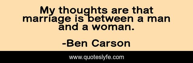 This page presents the quote "My thoughts are that marriage is between a man and a woman.". Author of this quote is Ben Carson. This quote is about woman, thoughts, man,.