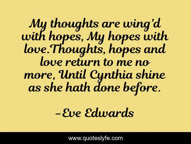 This page presents the quote "My thoughts are wing'd with hopes, My hopes with love.Thoughts, hopes and love return to me no more, Until Cynthia shine as she hath done before.". Author of this quote is Eve Edwards. This quote is about love, hope, eve-edwards, affection, the-rogue-s-princess, thoughts,.