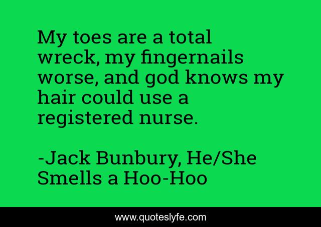 This page presents the quote "My toes are a total wreck, my fingernails worse, and god knows my hair could use a registered nurse.". Author of this quote is Jack Bunbury, He/She Smells a Hoo-Hoo. This quote is about glamour, style, beauty, humorous, bad-day, hair,.