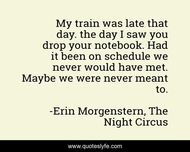 This page presents the quote "My train was late that day. the day I saw you drop your notebook. Had it been on schedule we never would have met. Maybe we were never meant to.". Author of this quote is Erin Morgenstern, The Night Circus. .