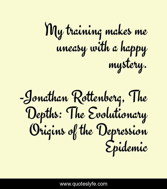 This page presents the quote "My training makes me uneasy with a happy mystery.". Author of this quote is Jonathan Rottenberg, The Depths: The Evolutionary Origins of the Depression Epidemic. This quote is about training, therapy, psychology, depression,.