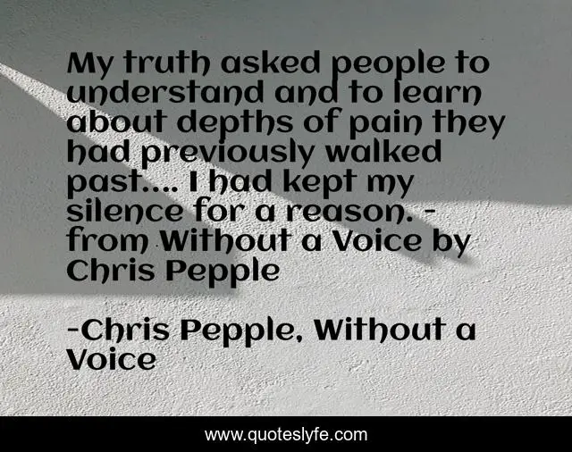 This page presents the quote "My truth asked people to understand and to learn about depths of pain they had previously walked past…. I had kept my silence for a reason. - from Without a Voice by Chris Pepple". Author of this quote is Chris Pepple, Without a Voice. This quote is about silence-speaks, voiceless, finding-your-voice, courage, truth, fear, silence,.
