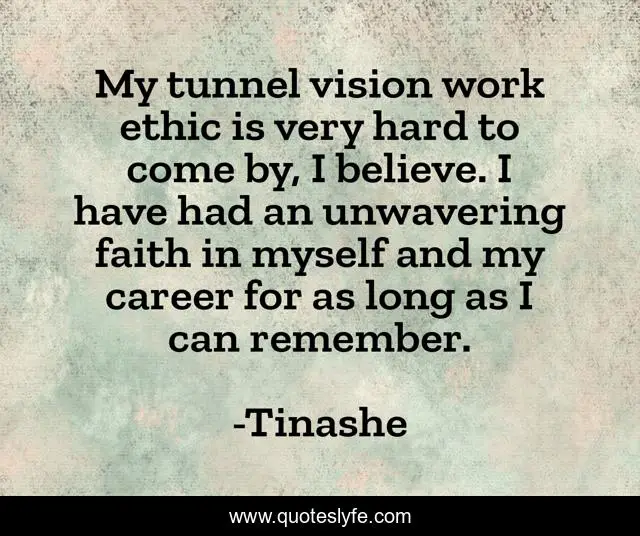 This page presents the quote "My tunnel vision work ethic is very hard to come by, I believe. I have had an unwavering faith in myself and my career for as long as I can remember.". Author of this quote is Tinashe. This quote is about myself, work, vision,.