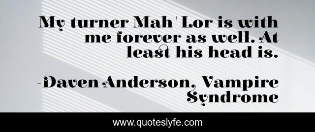 This page presents the quote "My turner Mah'Lor is with me forever as well. At least his head is.". Author of this quote is Daven Anderson, Vampire Syndrome. This quote is about head, humor, vampire,.
