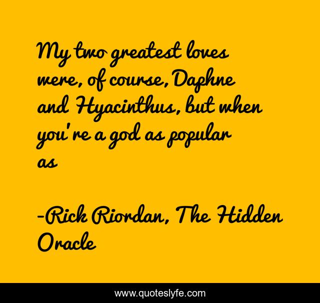 This page presents the quote "My two greatest loves were, of course, Daphne and Hyacinthus, but when you're a god as popular as". Author of this quote is Rick Riordan, The Hidden Oracle. This quote is about funny, demigods, mythology, love, romance, comedy, affection,.
