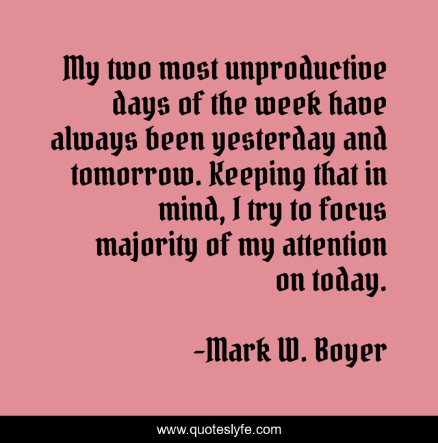 This page presents the quote "My two most unproductive days of the week have always been yesterday and tomorrow. Keeping that in mind, I try to focus majority of my attention on today.". Author of this quote is Mark W. Boyer. This quote is about team-direction, confidence, motivational-inspirational, motivational, work-ethic, optimistic, inspirational, positive, enthusiasm,.