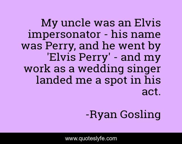This page presents the quote "My uncle was an Elvis impersonator - his name was Perry, and he went by 'Elvis Perry' - and my work as a wedding singer landed me a spot in his act.". Author of this quote is Ryan Gosling. This quote is about me, work, name,.