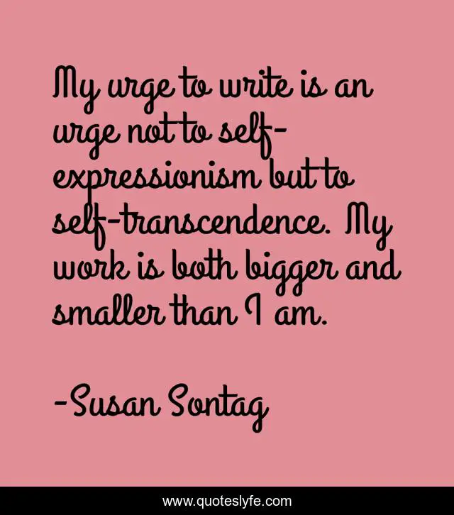 This page presents the quote "My urge to write is an urge not to self-expressionism but to self-transcendence. My work is both bigger and smaller than I am.". Author of this quote is Susan Sontag. .