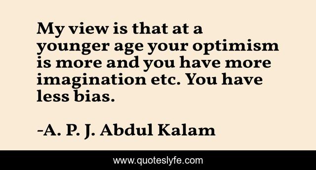 This page presents the quote "My view is that at a younger age your optimism is more and you have more imagination etc. You have less bias.". Author of this quote is A. P. J. Abdul Kalam. This quote is about imagination, optimism, view,.