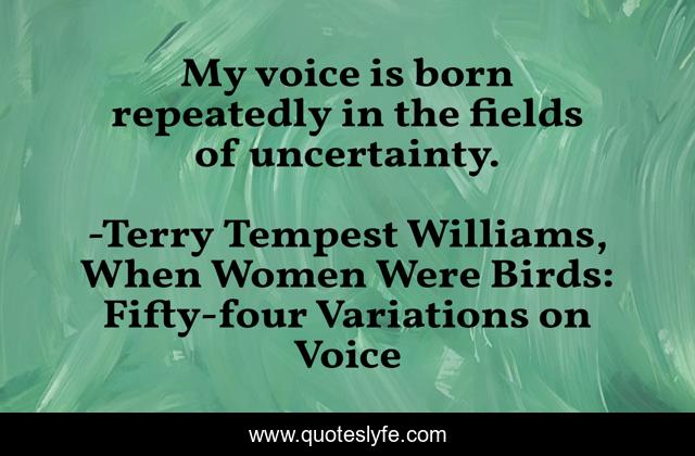 This page presents the quote "My voice is born repeatedly in the fields of uncertainty.". Author of this quote is Terry Tempest Williams, When Women Were Birds: Fifty-four Variations on Voice. This quote is about voice, birth, uncertainty,.