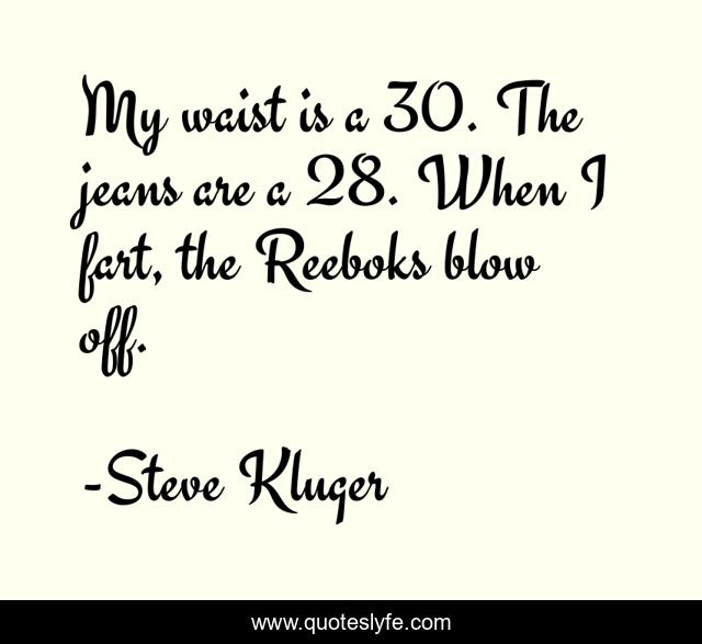 This page presents the quote "My waist is a 30. The jeans are a 28. When I fart, the Reeboks blow off.". Author of this quote is Steve Kluger. This quote is about self-consciousness, witty, humor,.