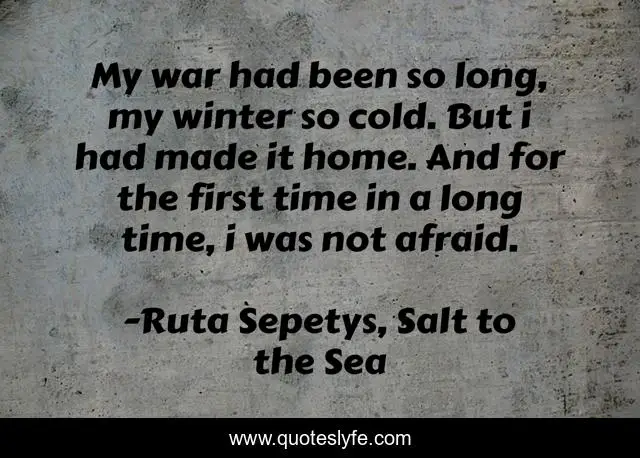 This page presents the quote "My war had been so long, my winter so cold. But i had made it home. And for the first time in a long time, i was not afraid.". Author of this quote is Ruta Sepetys, Salt to the Sea. This quote is about emilia, peace, emotional,.