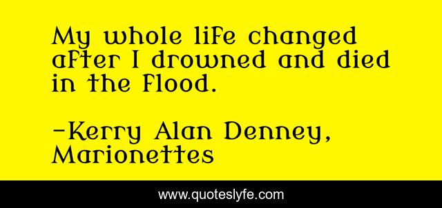 This page presents the quote "My whole life changed after I drowned and died in the flood.". Author of this quote is Kerry Alan Denney, Marionettes. This quote is about scifi-adventure, supernatural-powers, supernatural-thrillers, horror, urban-fantasy, paranormal, science-fiction-thrillers, supernatural-suspense, scifi,.