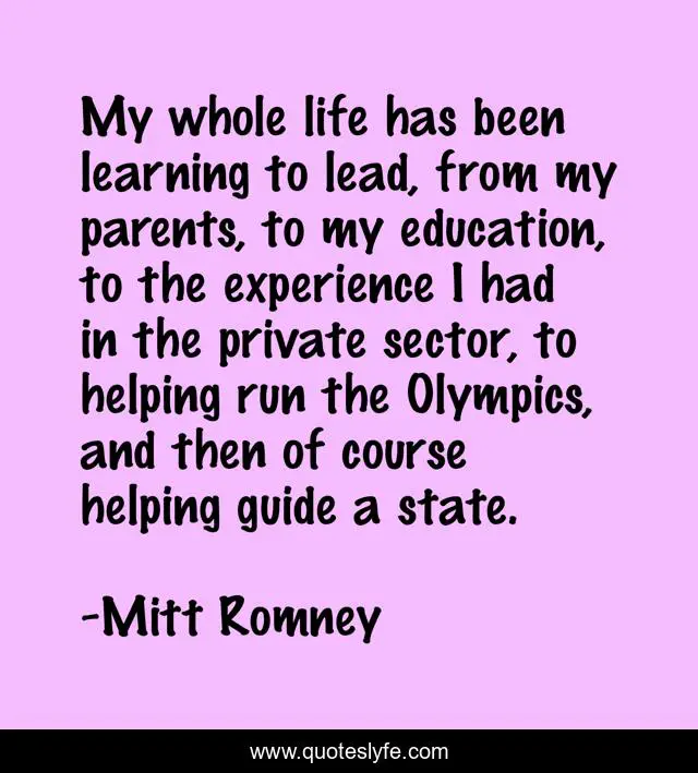 This page presents the quote "My whole life has been learning to lead, from my parents, to my education, to the experience I had in the private sector, to helping run the Olympics, and then of course helping guide a state.". Author of this quote is Mitt Romney. This quote is about life, education, experience,.