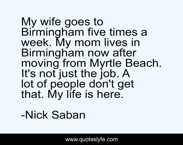 This page presents the quote "My wife goes to Birmingham five times a week. My mom lives in Birmingham now after moving from Myrtle Beach. It's not just the job. A lot of people don't get that. My life is here.". Author of this quote is Nick Saban. This quote is about life, job, wife,.