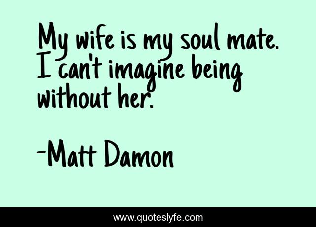 This page presents the quote "My wife is my soul mate. I can't imagine being without her.". Author of this quote is Matt Damon. This quote is about soul, her, wife,.