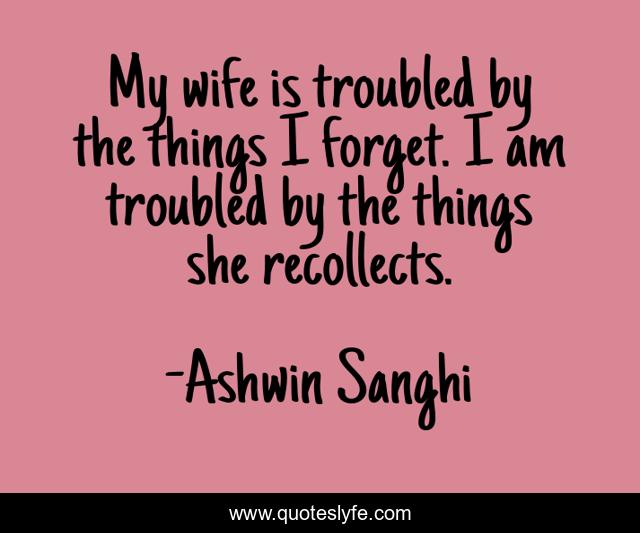 This page presents the quote "My wife is troubled by the things I forget. I am troubled by the things she recollects.". Author of this quote is Ashwin Sanghi. .