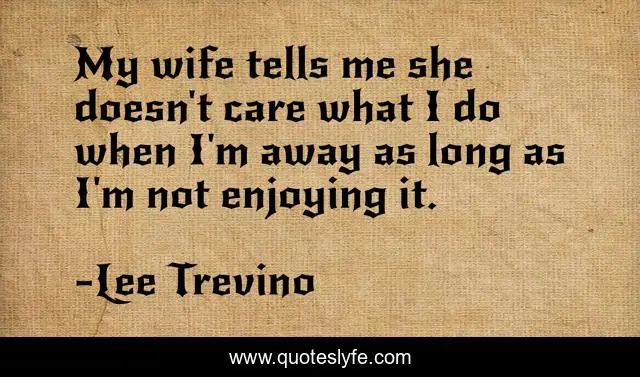 This page presents the quote "My wife tells me she doesn't care what I do when I'm away as long as I'm not enjoying it.". Author of this quote is Lee Trevino. This quote is about travel, cities,.