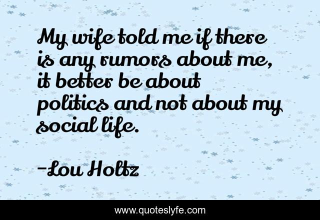 This page presents the quote "My wife told me if there is any rumors about me, it better be about politics and not about my social life.". Author of this quote is Lou Holtz. This quote is about me, life, wife,.