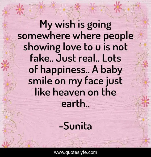 This page presents the quote "My wish is going somewhere where people showing love to u is not fake.. Just real.. Lots of happiness.. A baby smile on my face just like heaven on the earth..". Author of this quote is Sunita. .