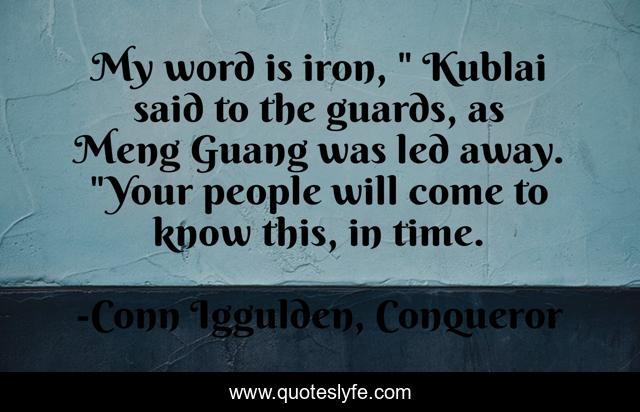 This page presents the quote "My word is iron, " Kublai said to the guards, as Meng Guang was led away. "Your people will come to know this, in time.". Author of this quote is Conn Iggulden, Conqueror. This quote is about word, kublai, people, guards, iron, time, come,.