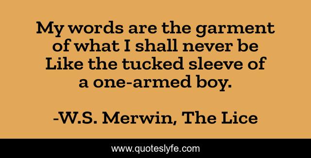 This page presents the quote "My words are the garment of what I shall never be Like the tucked sleeve of a one-armed boy.". Author of this quote is W.S. Merwin, The Lice. This quote is about poetry, words,.