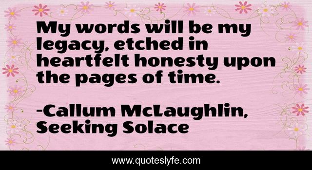 This page presents the quote "My words will be my legacy, etched in heartfelt honesty upon the pages of time.". Author of this quote is Callum McLaughlin, Seeking Solace. This quote is about poetry, words, writing,.