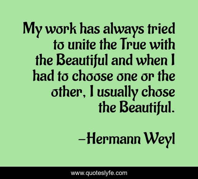 This page presents the quote "My work has always tried to unite the True with the Beautiful and when I had to choose one or the other, I usually chose the Beautiful.". Author of this quote is Hermann Weyl. This quote is about science, art, beauty,.