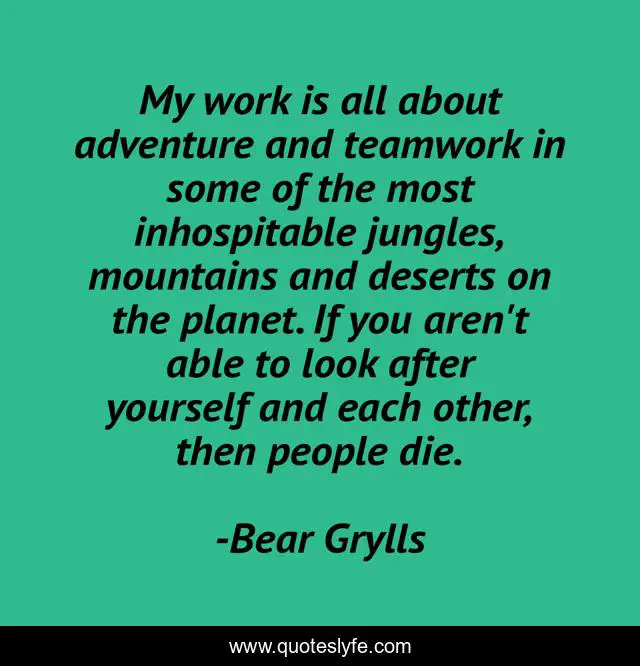 This page presents the quote "My work is all about adventure and teamwork in some of the most inhospitable jungles, mountains and deserts on the planet. If you aren't able to look after yourself and each other, then people die.". Author of this quote is Bear Grylls. This quote is about teamwork, adventure,.
