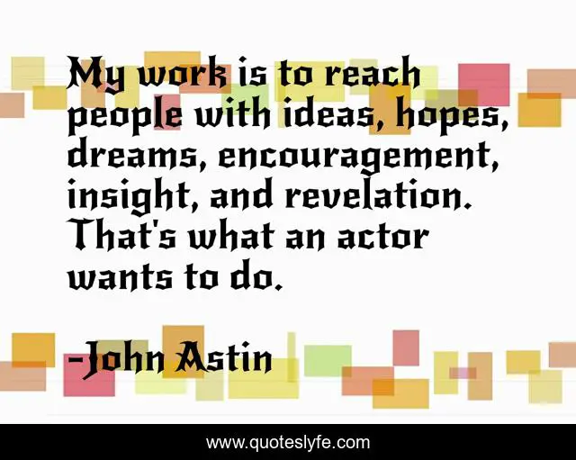 This page presents the quote "My work is to reach people with ideas, hopes, dreams, encouragement, insight, and revelation. That's what an actor wants to do.". Author of this quote is John Astin. This quote is about work, ideas, encouragement,.