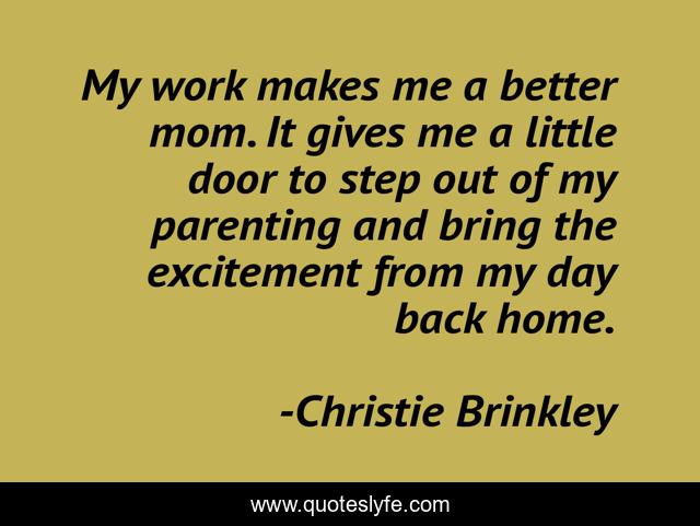 This page presents the quote "My work makes me a better mom. It gives me a little door to step out of my parenting and bring the excitement from my day back home.". Author of this quote is Christie Brinkley. This quote is about home, work, mom,.