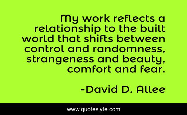 This page presents the quote "My work reflects a relationship to the built world that shifts between control and randomness, strangeness and beauty, comfort and fear.". Author of this quote is David D. Allee. This quote is about control, randomness, chaos, order,.