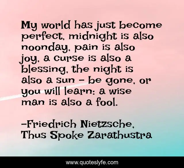 This page presents the quote "My world has just become perfect, midnight is also noonday, pain is also joy, a curse is also a blessing, the night is also a sun – be gone, or you will learn: a wise man is also a fool.". Author of this quote is Friedrich Nietzsche, Thus Spoke Zarathustra. This quote is about fool, world, wise, perfection,.